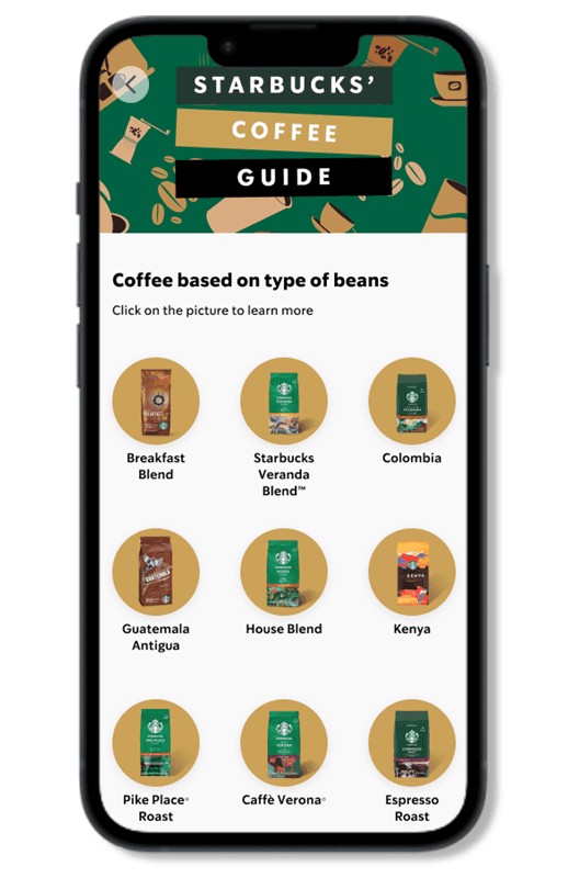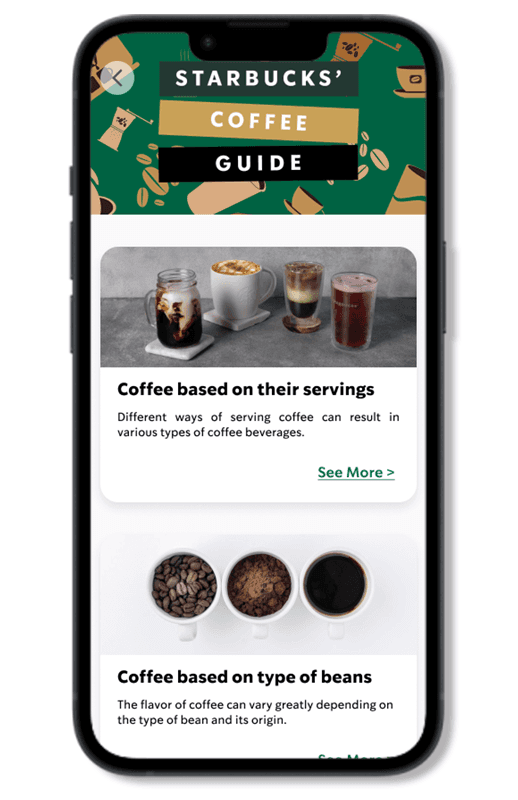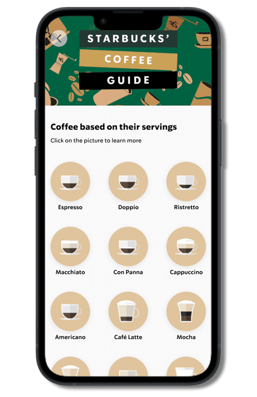 The Starbucks guide will have necessary information: Starbucks menu, size guide, coffee guide, payment and order guide. We added several features as well, such as promos, quiz, and simulation.