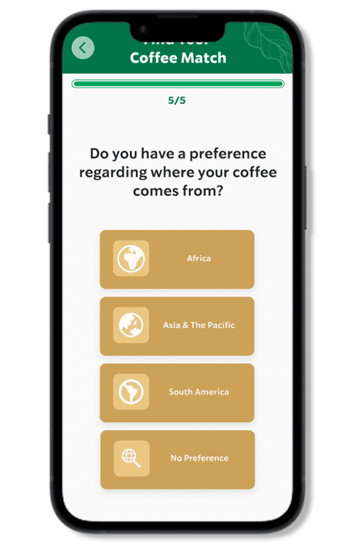 More accurate quiz result. The current quiz, “Find your coffee match,” will only provide you with a template result. This could be improved to be more accurate, but we believe it will take more time to implement additional research because we need to analyze every flavor note of every beverage to truly match the question.