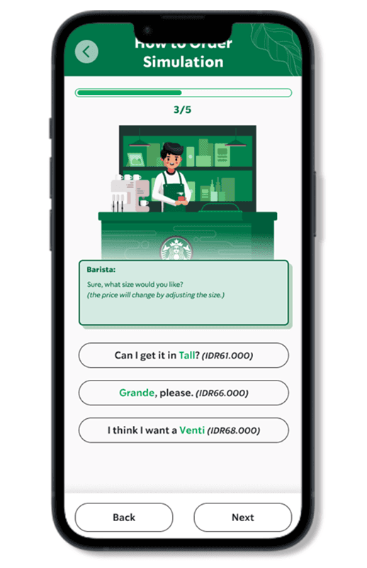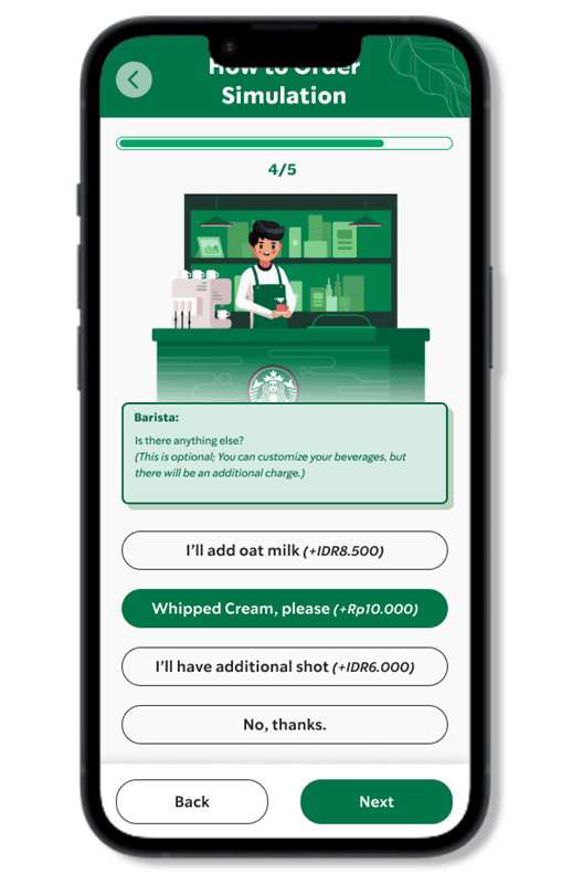 We took the concept from visual games and developed a new simulation game in which players take on the role of a Starbucks customer and interact with a barista in a manner similar to what they would encounter when ordering a Starbucks beverage in real life.