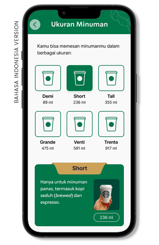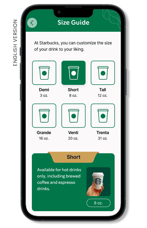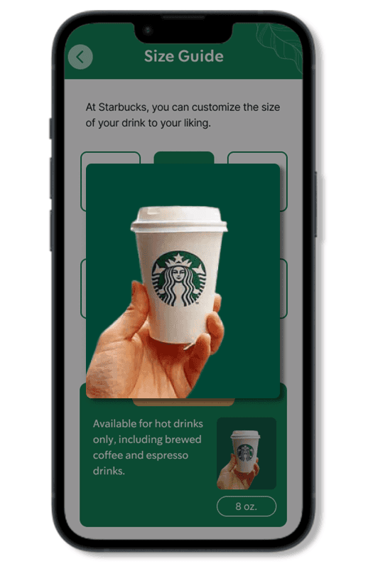 According to the desk research and user interviews, one of the most frequently mentioned issues that new customers encountered was how Starbucks names their cup sizes uniquely. Knowing how important branding is to Starbucks (based on our barista interview), we did not intend to change their naming; instead, we added a section where we provide the cup size information.