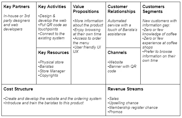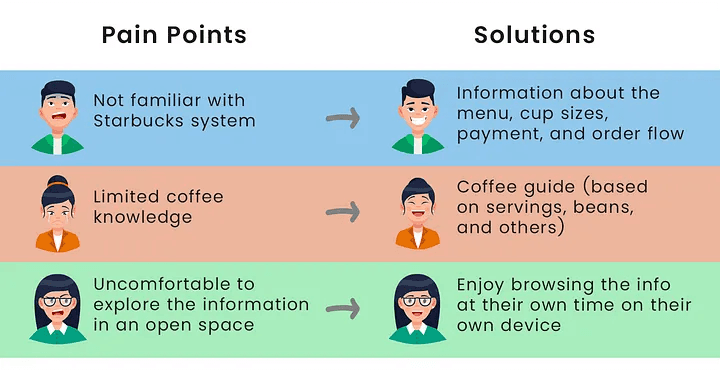 We had several good ideas that we could put into action, but after prioritizing them, we decided to create a scannable Starbucks' new customer guide website that customers could scan from QR code at various points throughout the store. This solution is actually very supported by the fact that we discovered during the immersion phase, where we found that many people in unfamiliar situations would first analyze their surroundings to make themselves more prepared for the situation.
